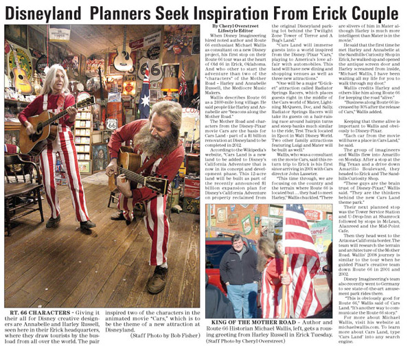Aby park co nejvěrněji vystihovala specifickou atmosféru Route 66, vydaly se přední tvůrčí kapacity od Disneyho, společně s kreativními řediteli Pixaru, na místo činu - tedy na starou dobrou šestašedesátku. Průvodce jim dělal spisovatel a publicista Michael Wallis, který byl odborným poradcem právě filmu Cars.